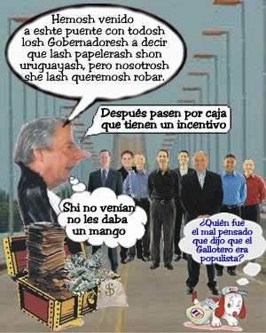 Pero para demostrar cómo se arma la unión de todos los Gobernadores argentinos detrás de una idea nazi, recordemos lo que dijo el presidente de la empresa Botnia y que publicáramos el 21 del pasado mes: El titular de Botnia confesó que las autoridades argentinas obligaron a empresas de construcción a rechazar negocios, bajo la amenaza de quedar fuera de la inversión pública. Dijo que tenían acuerdos con empresas que tuvieron que ser pospuestos por ese tema. "Las autoridades argentinas daban el siguiente mensaje: `puedes realizar ese trabajo, pero probablemente ya no habrá contratos públicos en el futuro, te será imposible contratar con el sector público argentino`. Así están las cosas".